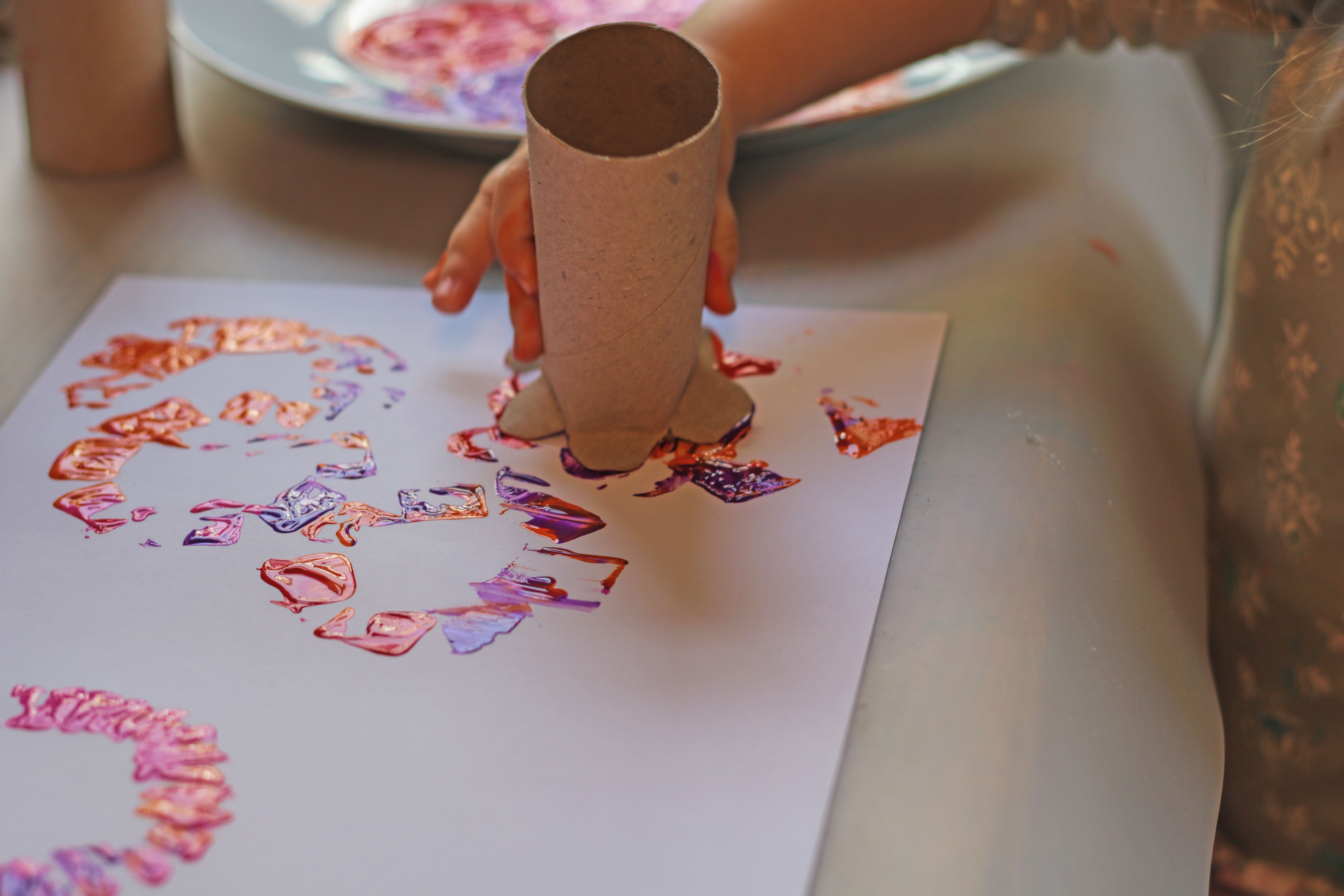 Gib die Fingerfarben auf einen Teller oder in eine flache Schale, damit die Rolle leicht in die Farbe getupft werden kann. Dann kann dein Kind direkt mit dem Drucken starten.