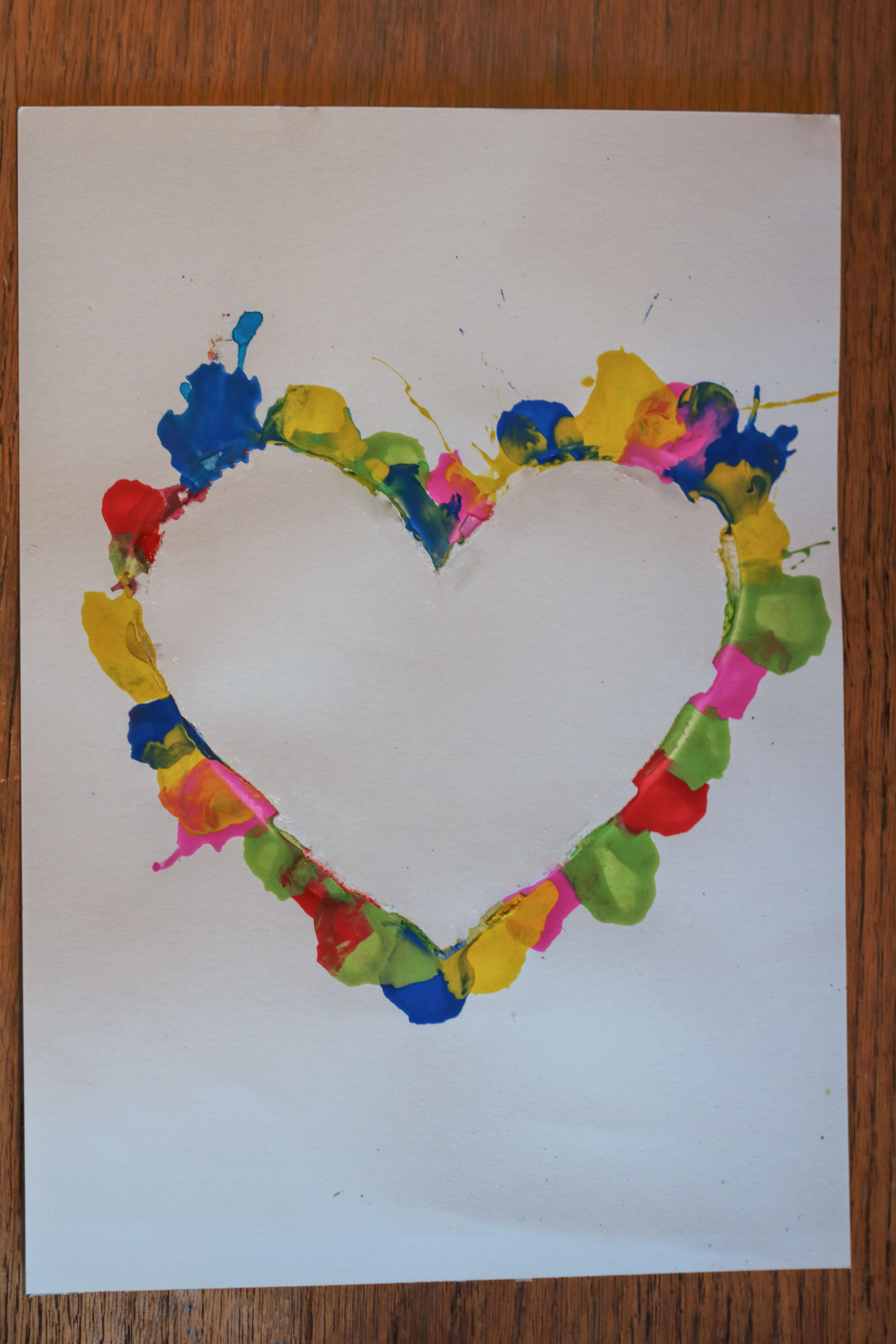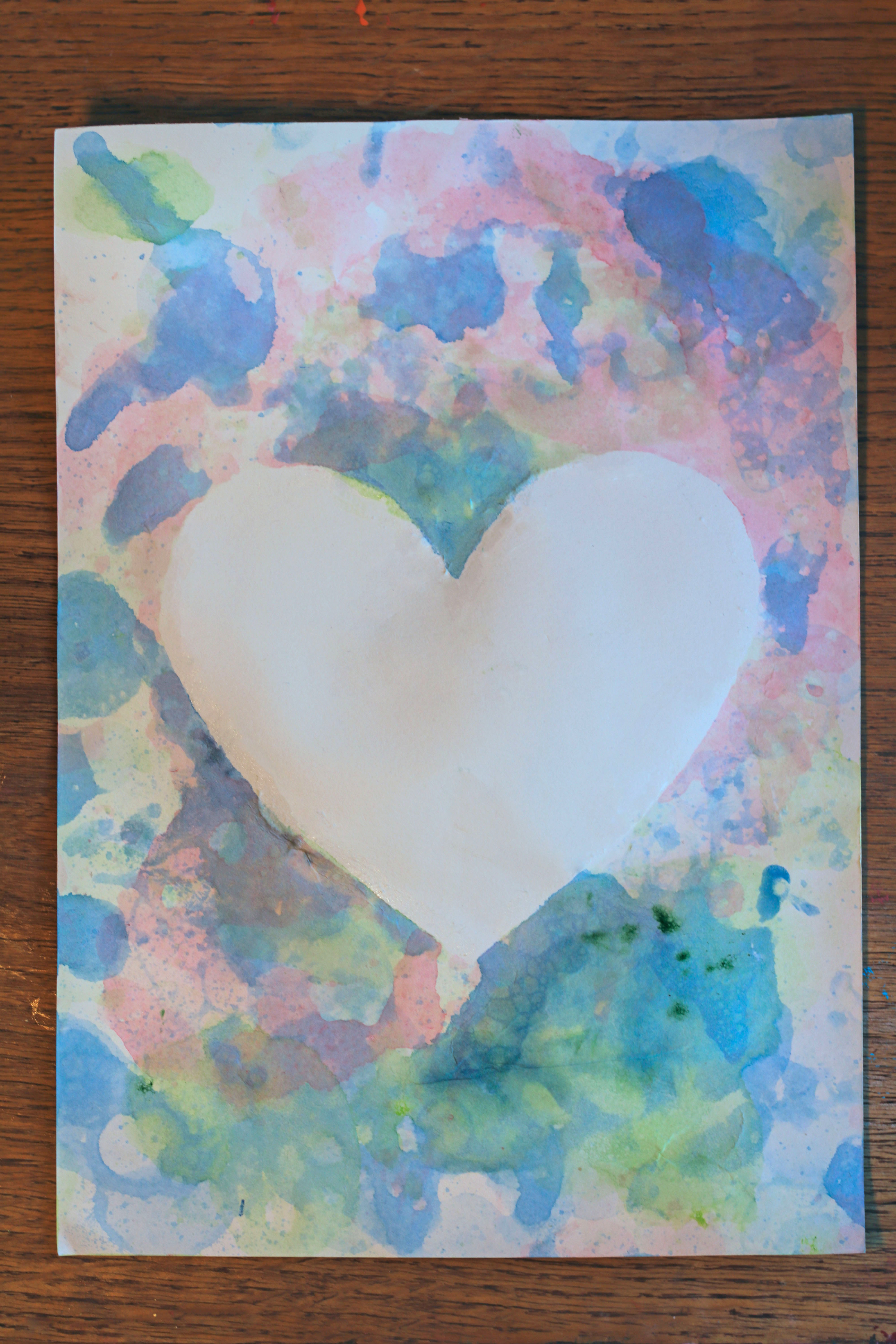 Sobald alles gut getrocknet ist, kann die Schablone vorsichtig abgezogen werden. So bleibt das Herz oder Motiv hell, während das Bild rundherum bunt leuchtet.