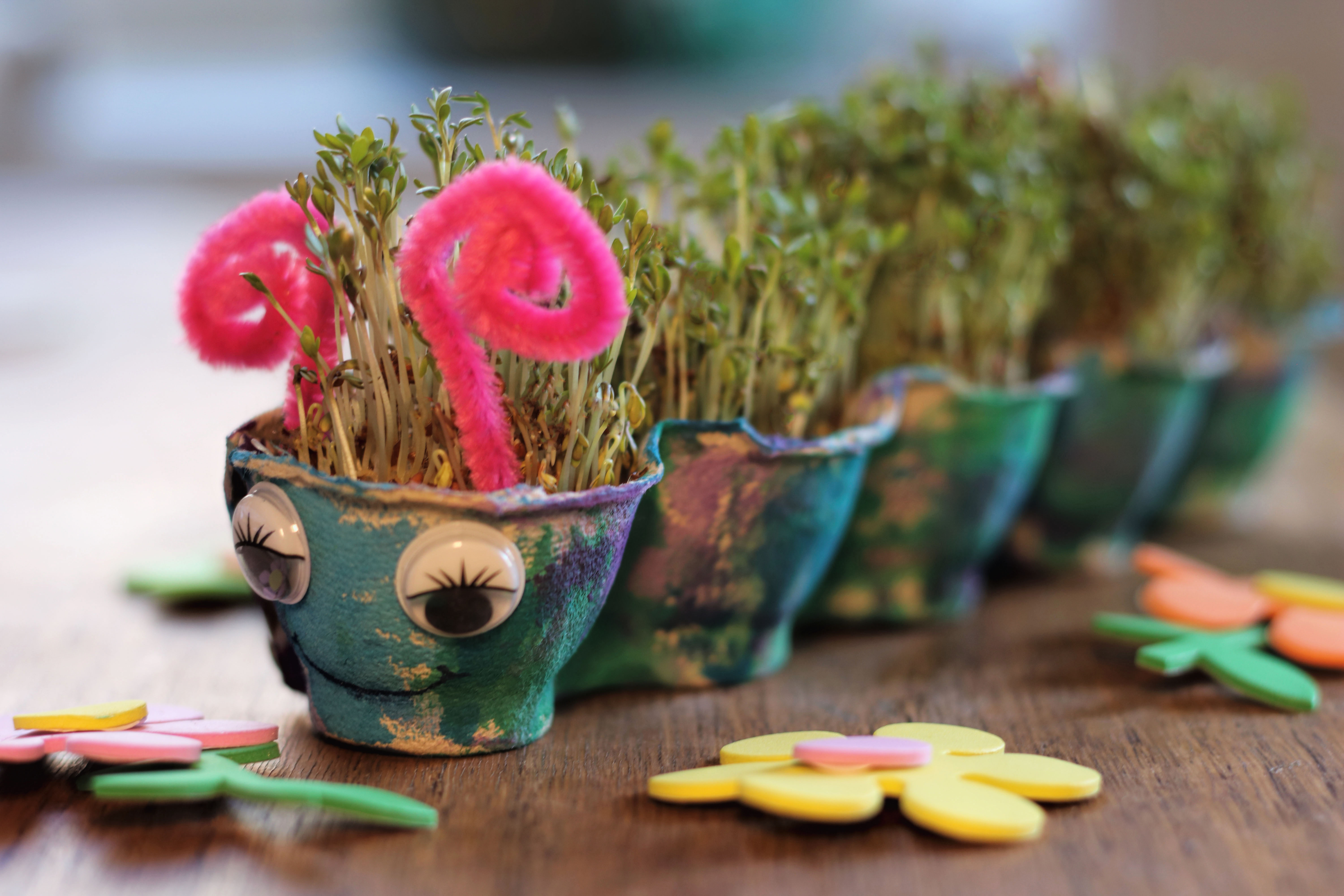 Aus einem Eierkarton lässt sich ganz einfach eine kleine Kresse-Raupe basteln, die nicht nur niedlich aussieht, sondern schon nach kurzer Zeit grüne „Haare“ bekommt. Das Bemalen macht kleinen Kindern viel Spaß und auch das Streuen der Kressesamen ist ein schöner Teil der Bastelidee. Später kann dein Kind dann jeden Tag beobachten, wie die Raupe weiterwächst.