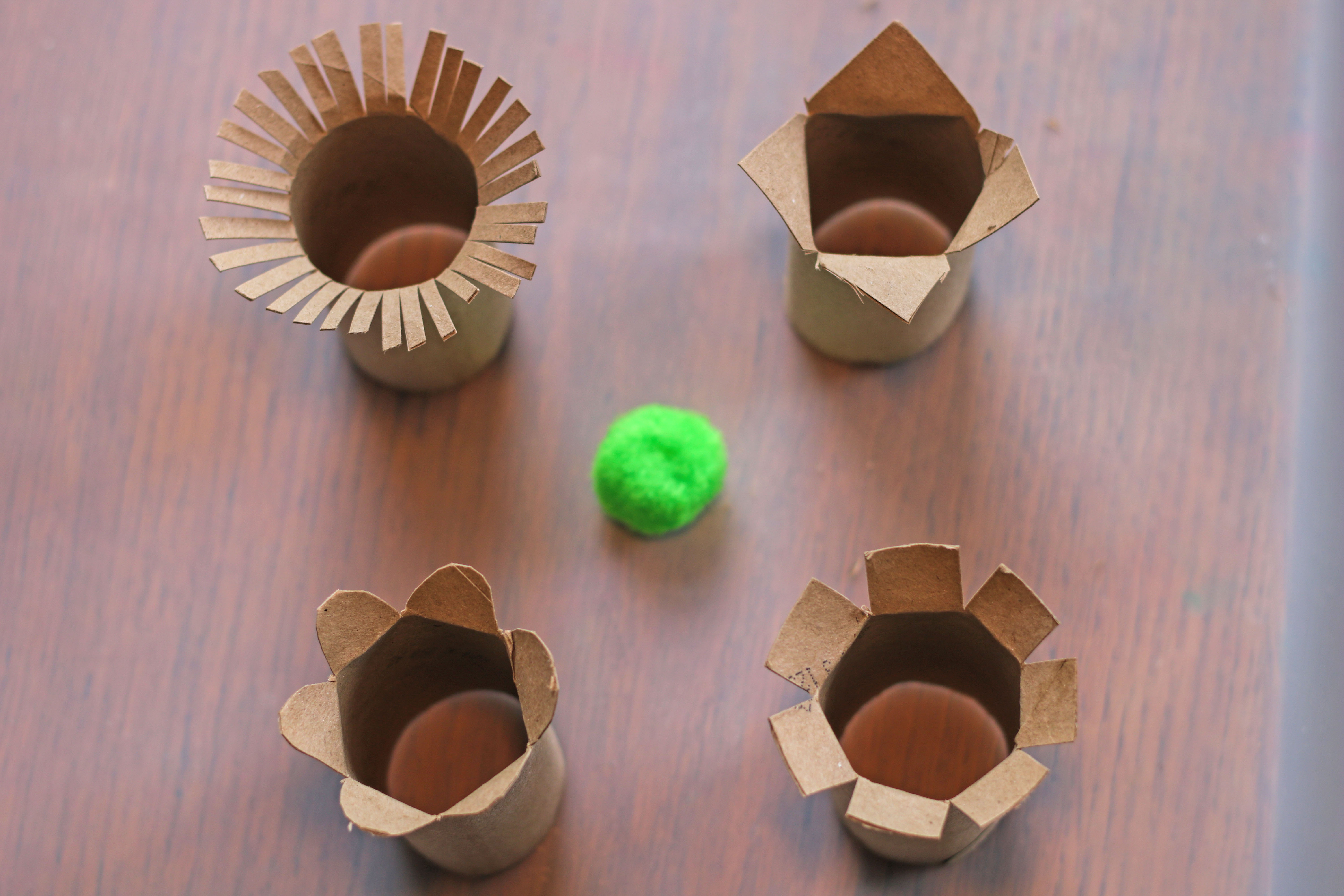 Schneide die Klopapierrolle oben mehrmals ein und biege die Streifen leicht nach außen. Du kannst die einzelnen Blütenblätter in unterschiedlichen Formen und Breiten schneiden – so entsteht eine schöne Blumenform.