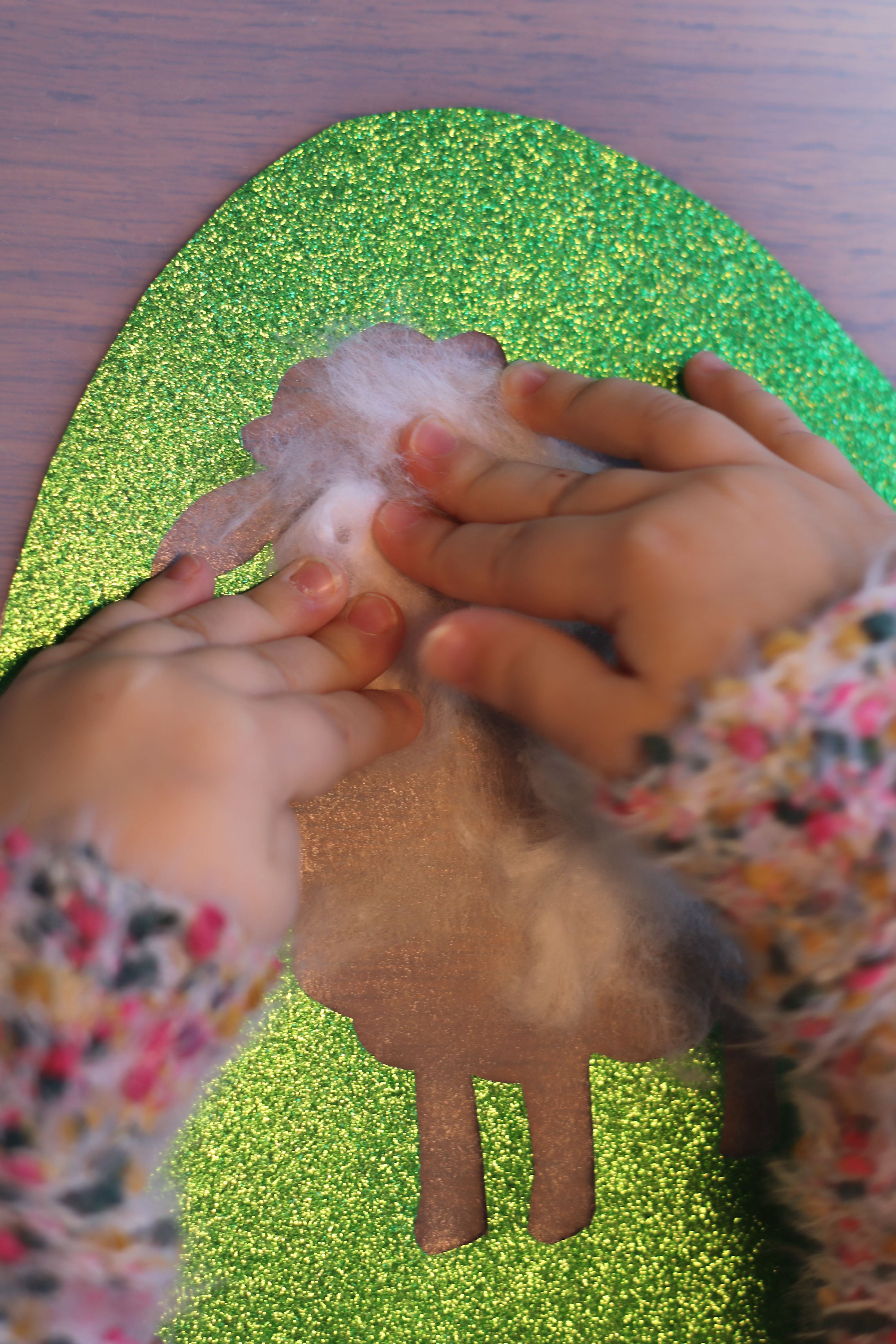 Die kleinen Watte-Stücke werden nun auf das Schaf geklebt. Gerade bei kleinen Kindern darf dabei ruhig ein größerer Wattebausch entstehen.