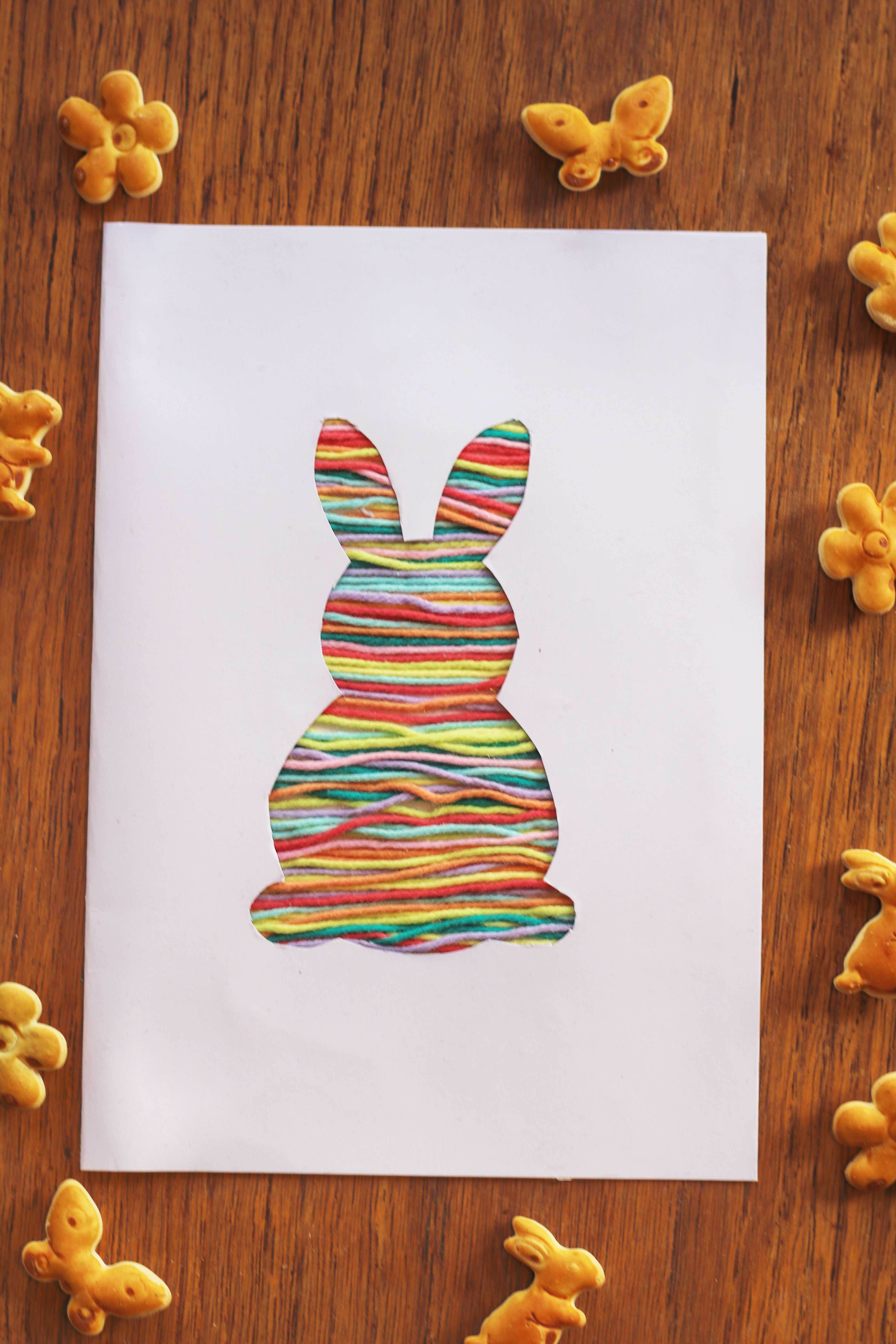 Der Woll-Hase eignet sich auch wunderbar als Osterkarte. Einfach von hinten ein festes Blatt Papier dagegen kleben – so entsteht eine stabile Karte zum Verschenken.